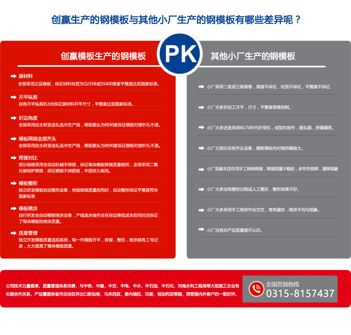 唐山創(chuàng)贏模板有限公司(原唐山豐南雙贏金屬結(jié)構(gòu)廠)始建于一九九七年,是具規(guī)模實力的組合模板生產(chǎn)企業(yè),公司自行設(shè)計制造的十二條上卷,連軋,連沖,整形,機械人焊接,調(diào)直,噴漆,打包鋼模板生產(chǎn),實現(xiàn)了自動化一條龍生產(chǎn),品質(zhì)優(yōu),效率高,規(guī)格型號為:寬度100-1200mm, 長度300-3000mm, 板厚1.8-4.0mm。 年產(chǎn)量可達200萬平方米,公司創(chuàng)新研制的輕型鋼框組合快拆鋼模板體系,是傳統(tǒng)組合小鋼模升級換代產(chǎn)品,可滿足房建,地下管廊,涵洞,公路,鐵路及各類施工企業(yè)的需要,輕型鋼框組合快拆鋼模板體系介紹及應用,已在2017年《施工技術(shù)》雜志及《模板腳手架行業(yè)協(xié)會》雜志發(fā)表,詳情請查閱公司網(wǎng)站。 公司生產(chǎn)的噴漆鋼跳板,鍍鋅鋼跳板,采用連軋一次沖孔,承載力大,孔距均勻,外形美觀,年產(chǎn)量可達50萬塊,公司獨創(chuàng)的C型鋼生產(chǎn)線,以其產(chǎn)量高,強度大,成本低,交活迅速,在同行業(yè)占有較大優(yōu)勢,可與C型鋼廠家及各類施工企業(yè)合作共贏.